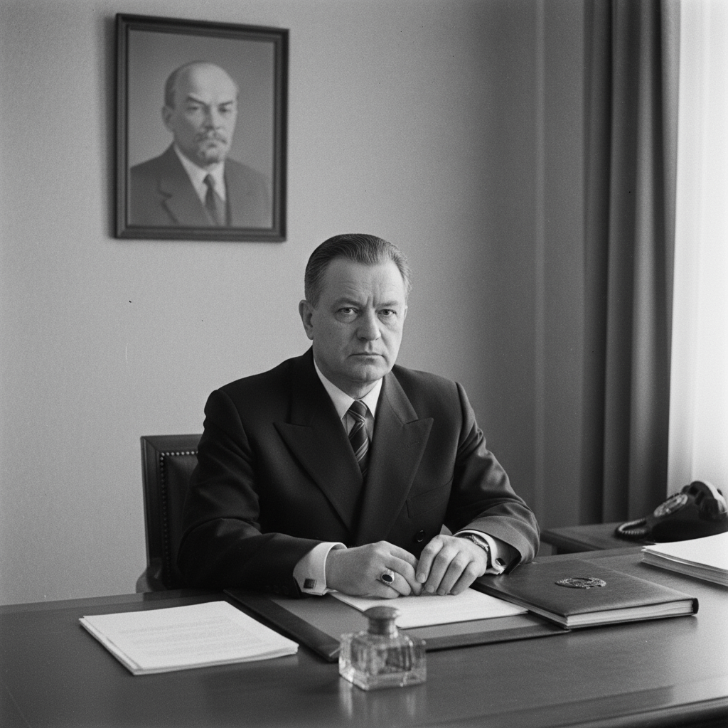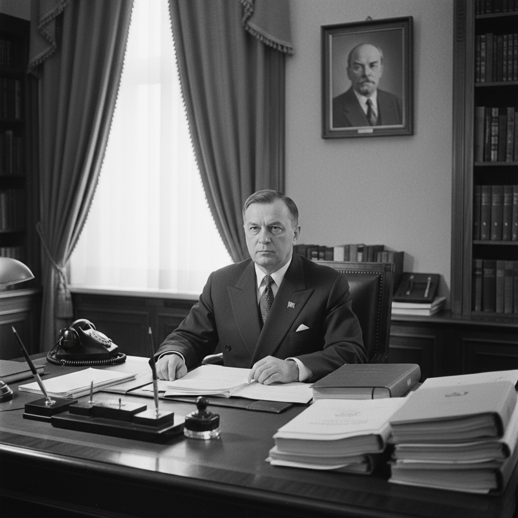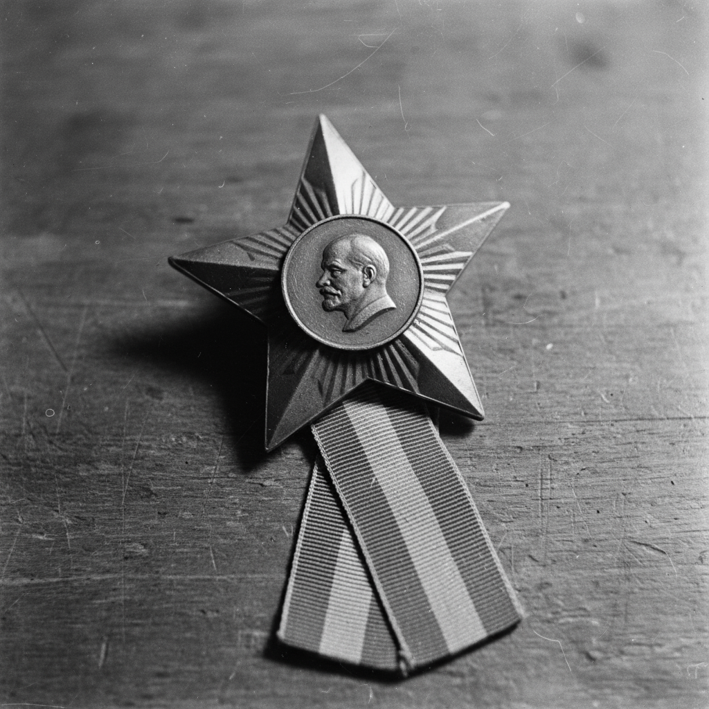 La imagen de la Orden de Lenin simboliza el reconocimiento oficial a sus contribuciones. Esta condecoración, conferida en mayo de 1961, poco después del éxito del Vostok-1, representaba el más alto honor civil en la Unión Soviética y reconocía tanto su papel en el programa espacial como su liderazgo en el desarrollo industrial.